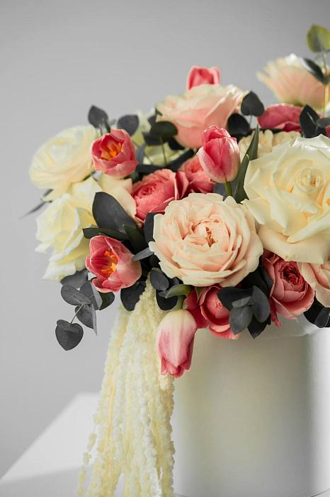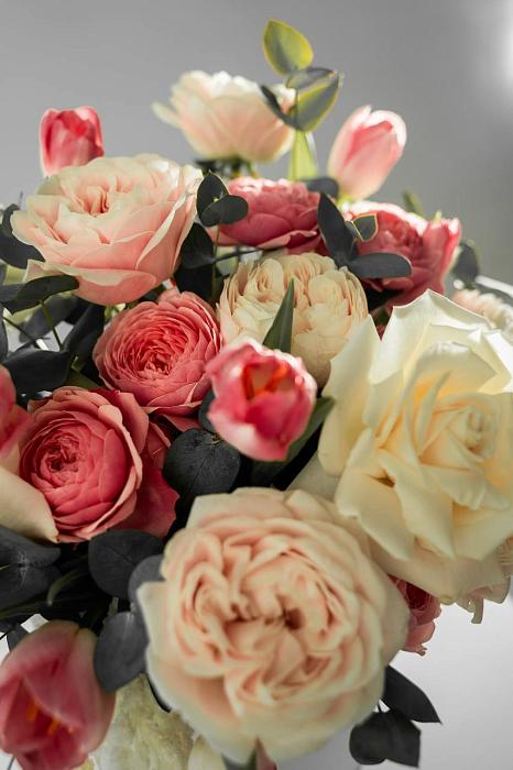 Пионовидные розы, Роза кустовая, Розы российские, Тюльпаны, Эвкалипт