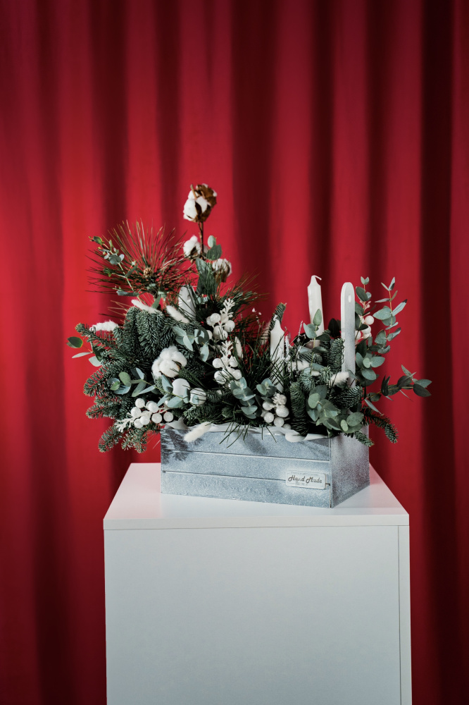 Новогодня композиция 040 из елки, эвкалипта, сосны, хлопка и свечей