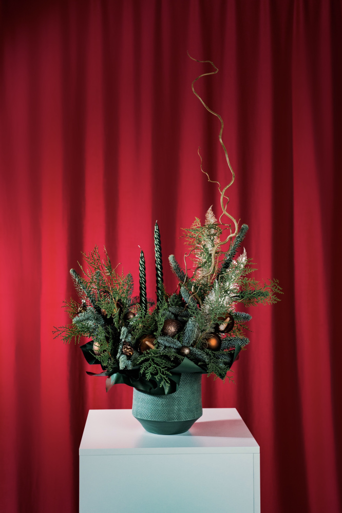 Новогодня композиция 041 из елки, туи, корилиуса, свечей и ёлочных игрушек