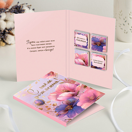 Открытка 4 шоколадки "С днем рождения (цветок)"