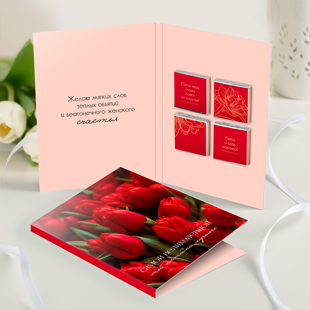Открытка 4 шоколадки "Самой великолепной (красные тюльпаны)"